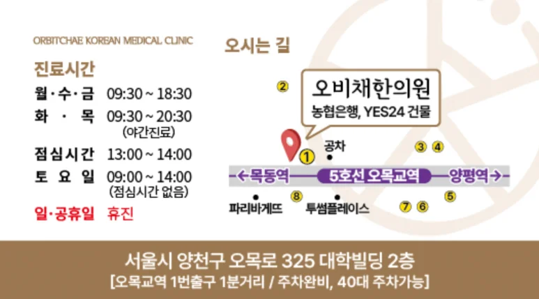 안녕하세요. 오목교역 1번 출구 앞, 오비채한의원입니다.