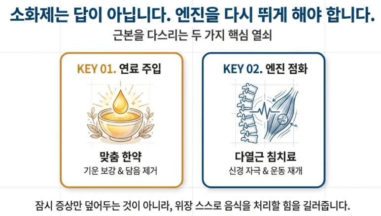 근본적인 해결을 위해서는 단순히 증상을 잠재우는 것이 아니라, 멈춰버린 위장의 엔진을 다시 뛰게 만들어야 합니다.
