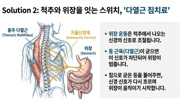 특히 흉추 부위의 다열근을 침으로 자극하여 긴장을 풀어주면, 위장으로 가는 신경 신호가 원활해지면서 위장 운동이 개선되는 효과를 기대할 수 있습니다.