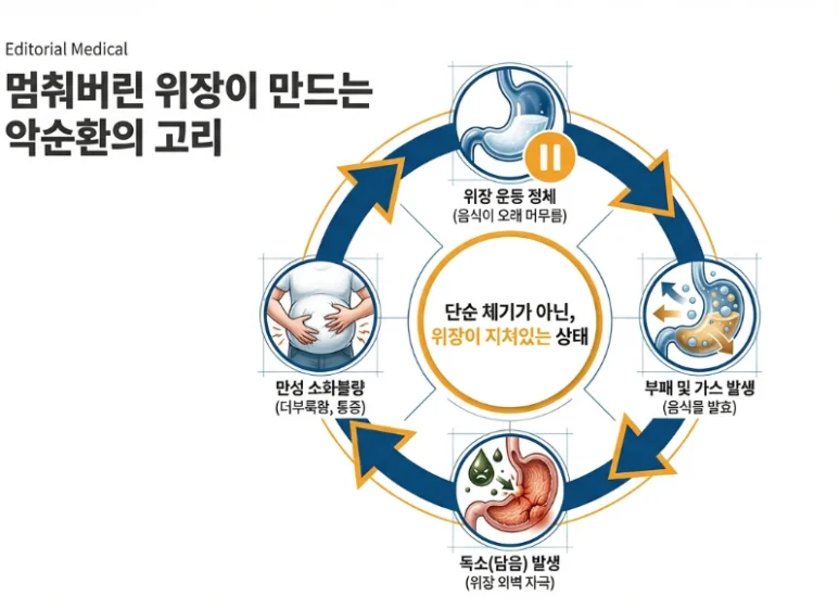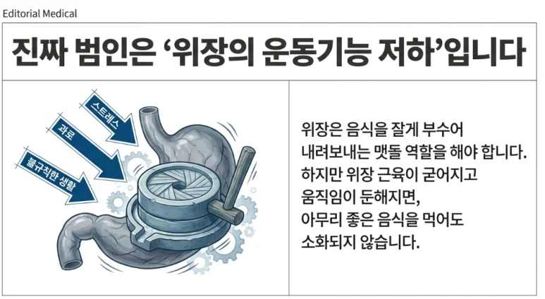 그렇다면 진짜 문제는 무엇일까요? 저는 그 핵심 원인으로 ‘위장의 운동기능 저하’를 꼽습니다.