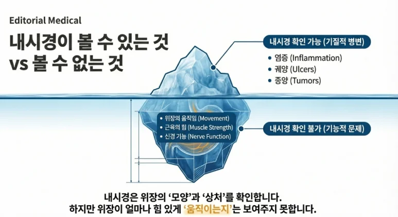 즉, 위장의 모양이나 상처는 확인할 수 있어도, 위장이 실제로 ‘움직이는 힘’이 얼마나 좋은지는 파악하기 어렵습니다.
